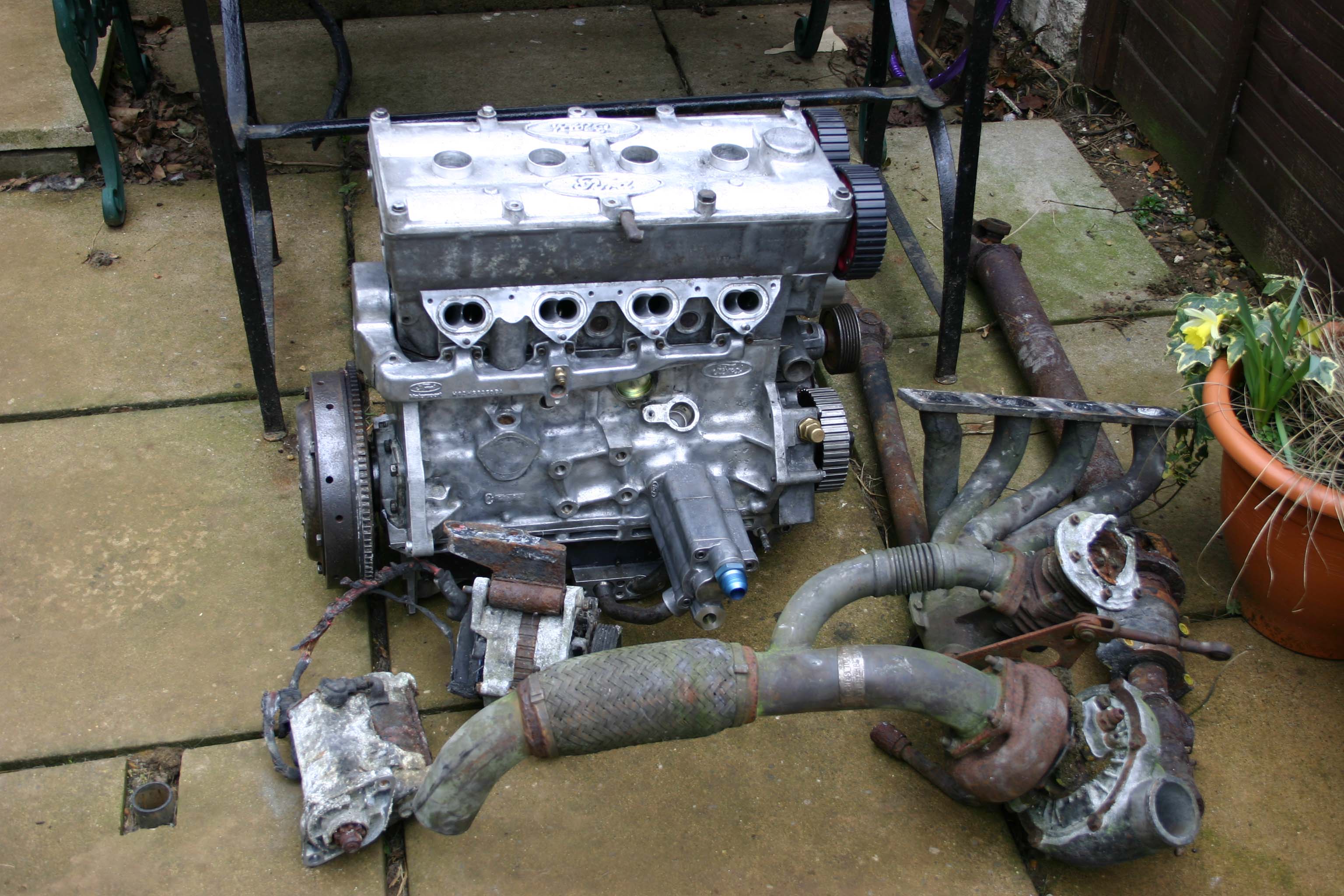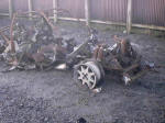 The text is copied here, "Fire damaged original Ford RS200. Unregistered car having 4 miles only before fire. Major mechanical components have survived very well and the engine has been stripped and examined by a professional performance engine builder. Rings replaced, new gaskets etc. Head and sump now off for inspection. Axles, differentials, gearbox and damaged spaceframe and suspension all available. Excellent opportunity to acquire a supercar project or a stock of spares for another car.